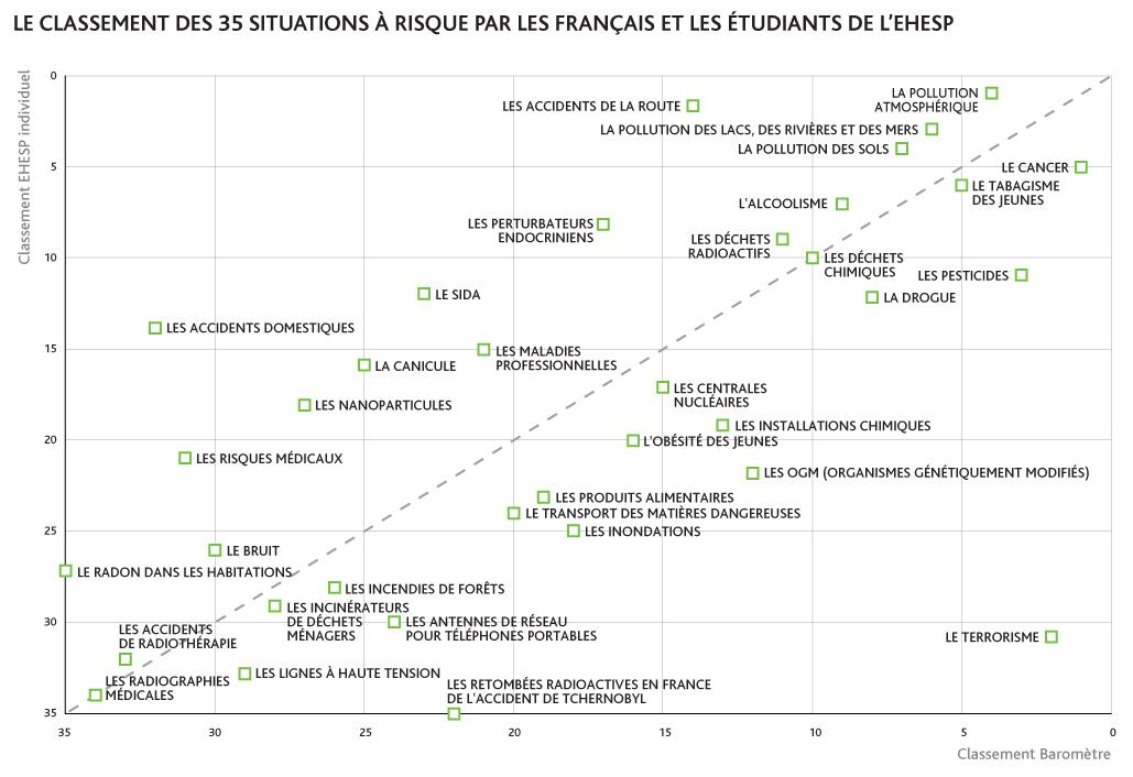 Au mois de mars 2019, un exercice pédagogique a été conduit auprès des 37 étudiants du master 1 en Santé Publique, parcours Sciences Humaines et Sociales de l’EHESP et l’université Rennes 1. Il s’agissait de comparer leur perception des risques à celle des Français, présentée dans le Baromètre IRSN.